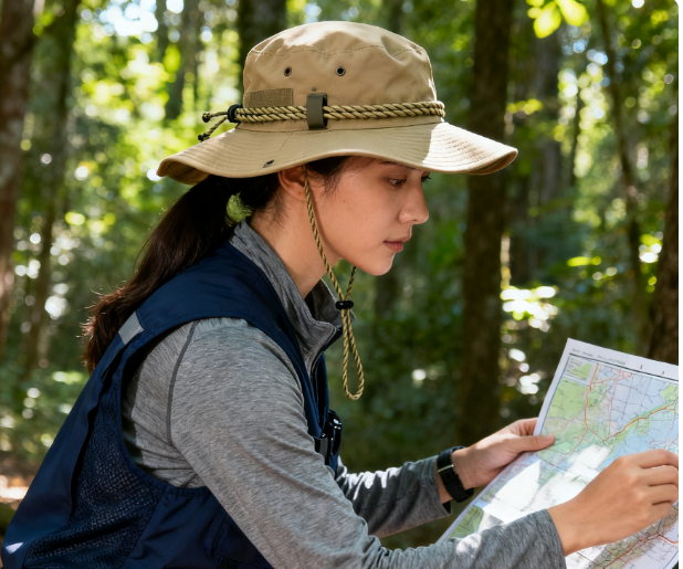 佩戴位置的調整同樣關鍵。標準佩戴時,帽檐應與眉弓上方保持1-2厘米的水平距離,這個位置既能最大限度遮擋陽光直射眼部,又不會阻礙前方視野,尤其在觀察地形、使用觀測設備時更為重要。同時,帽身需自然貼合頭型,避免向單側偏移,確保兩側耳孔不被帽身擠壓,保障聽覺對環境聲音(如水流、異響)的敏銳捕捉,這在戶外場景中是不可或缺的安全保障。?