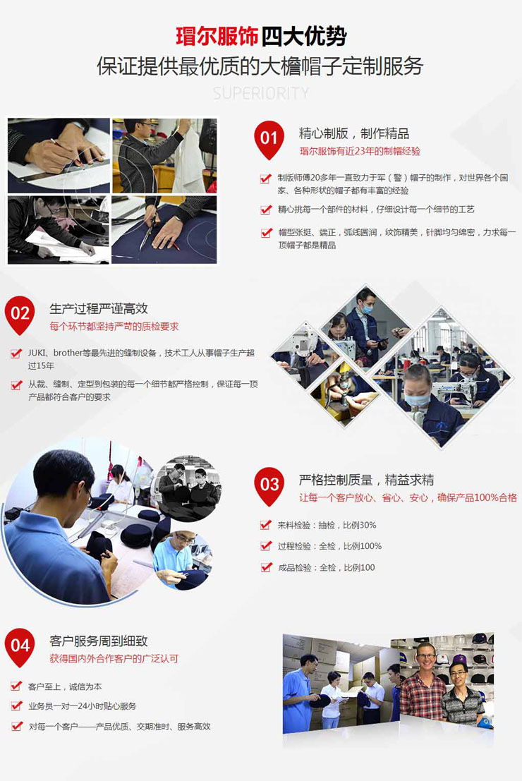 深圳市瑁爾服飾有限公司 21年專業制帽子廠家,生產、定制、加工各種軍帽子、職業工作帽子、大蓋帽子、博士學士帽子、棒球帽子、高爾夫球帽子、運動帽子、平板嘻哈棒球帽子、廣告帽子、太陽帽子、空姐帽子、布帽子、工廠帽子、職業帽子、醫生帽、護士帽子、廚師帽、防靜電帽、等各類帽子,我們過硬的質量、新穎的款式、精湛的做工、合理的價格、期待長期合作!